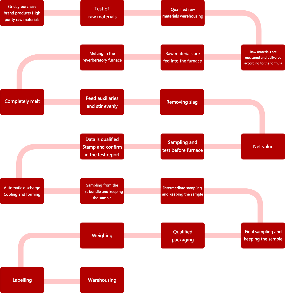 Professionally and rigorously purchase the brand (Zn99.995) high purity zinc, high purity aluminum, magnesium and copper. Introduce the modern German spark direct reading spectrometer for product inspection, the inspection time is equal but the effect is very fast, accurate and eco-friendly. The raw materials are stored in the warehouse according to the procedures after passing inspection, ensure first in and first out. The professional warehouse keep must measure and weigh the raw materials according to the formula of alloy before production, the raw materials are fed into the reverberatory furnace according to the formula, and then the auxiliary materials are put into the furnace, after stirring, the temperature is measure, after reaching the standard temperature, the scum is removed, the net value is taken, and then the sample is taken in the alloy liquid in the furnace to test the chemical composition and density. From the sampling to the test result, it is measured by modern German spark direct reading spectrometer, the result is obtained within 5 minutes. After the data has reached the standard, the inspector signs and confirms in the alloy composition table. Test according to the modern sampling principle, it is convenient for customers to trace back. After packing, the product is weighed and marked, and then stored in the warehouse.